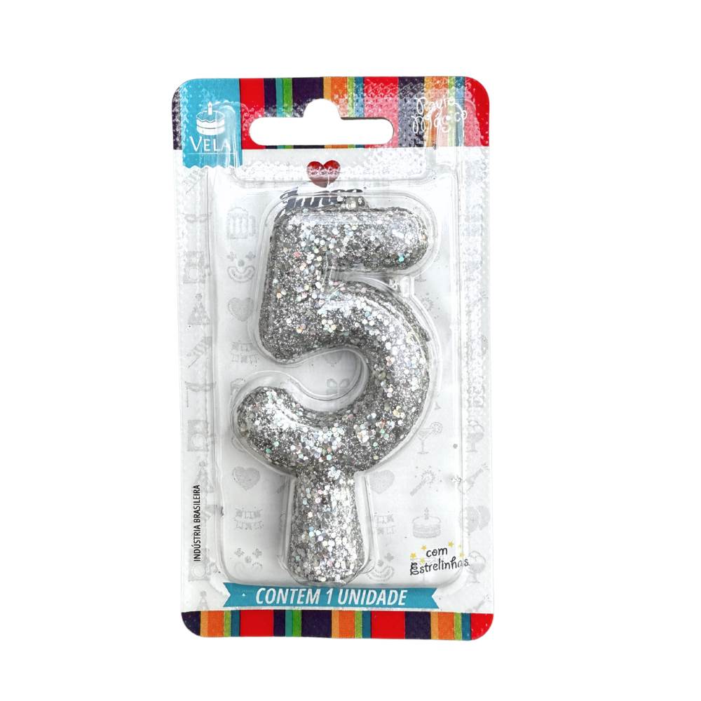 Vela Aniversário Holográfica com Gliter Prata Nº 5 Junco