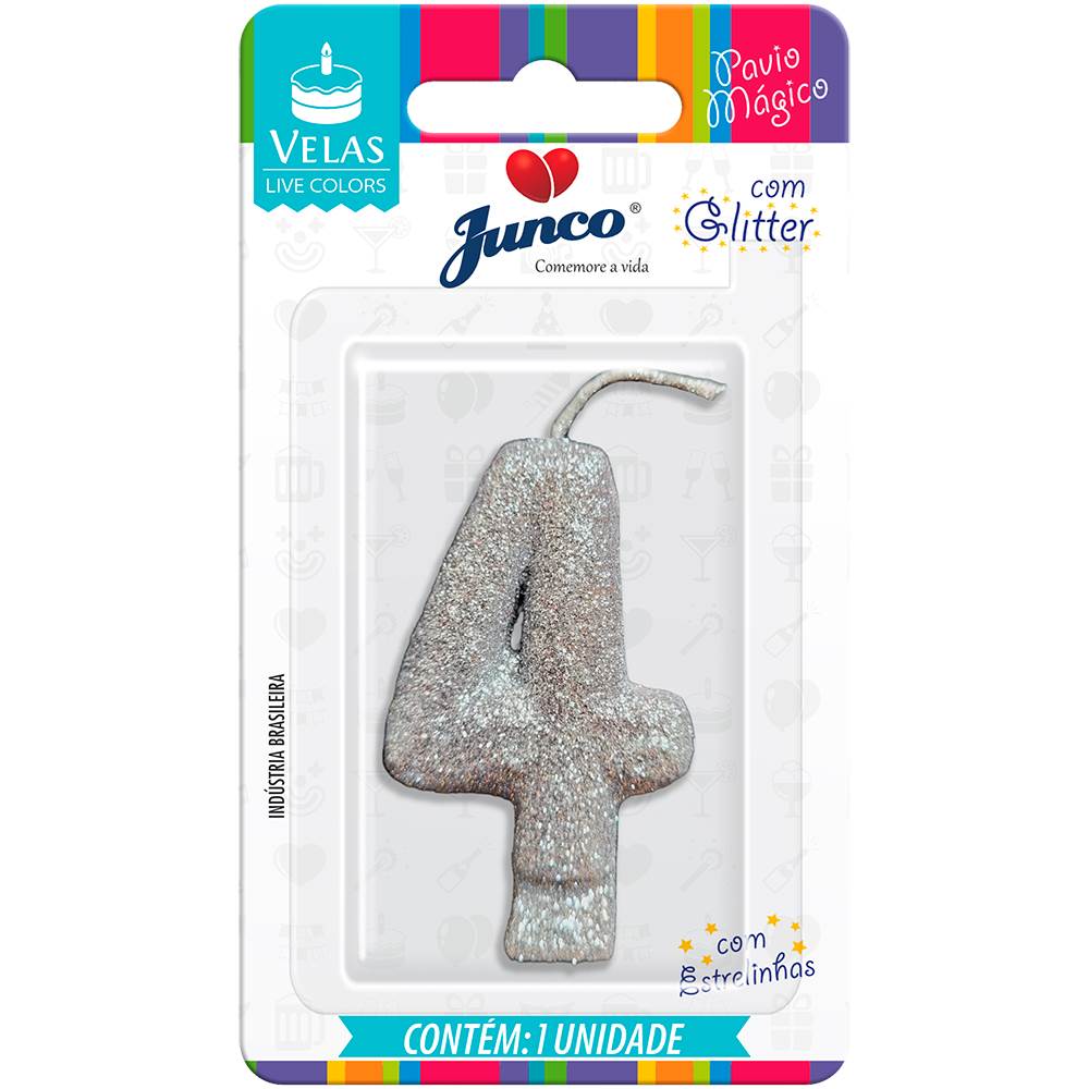 Vela Aniversário Live Colors com Gliter Prata Nº 4 Junco