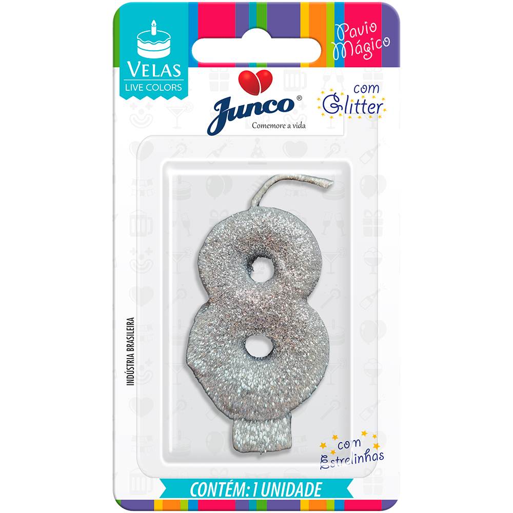 Vela Aniversário Live Colors com Gliter Prata Nº 8 Junco