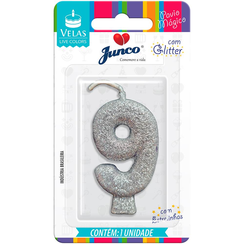Vela Aniversário Live Colors com Gliter Prata Nº 9 Junco
