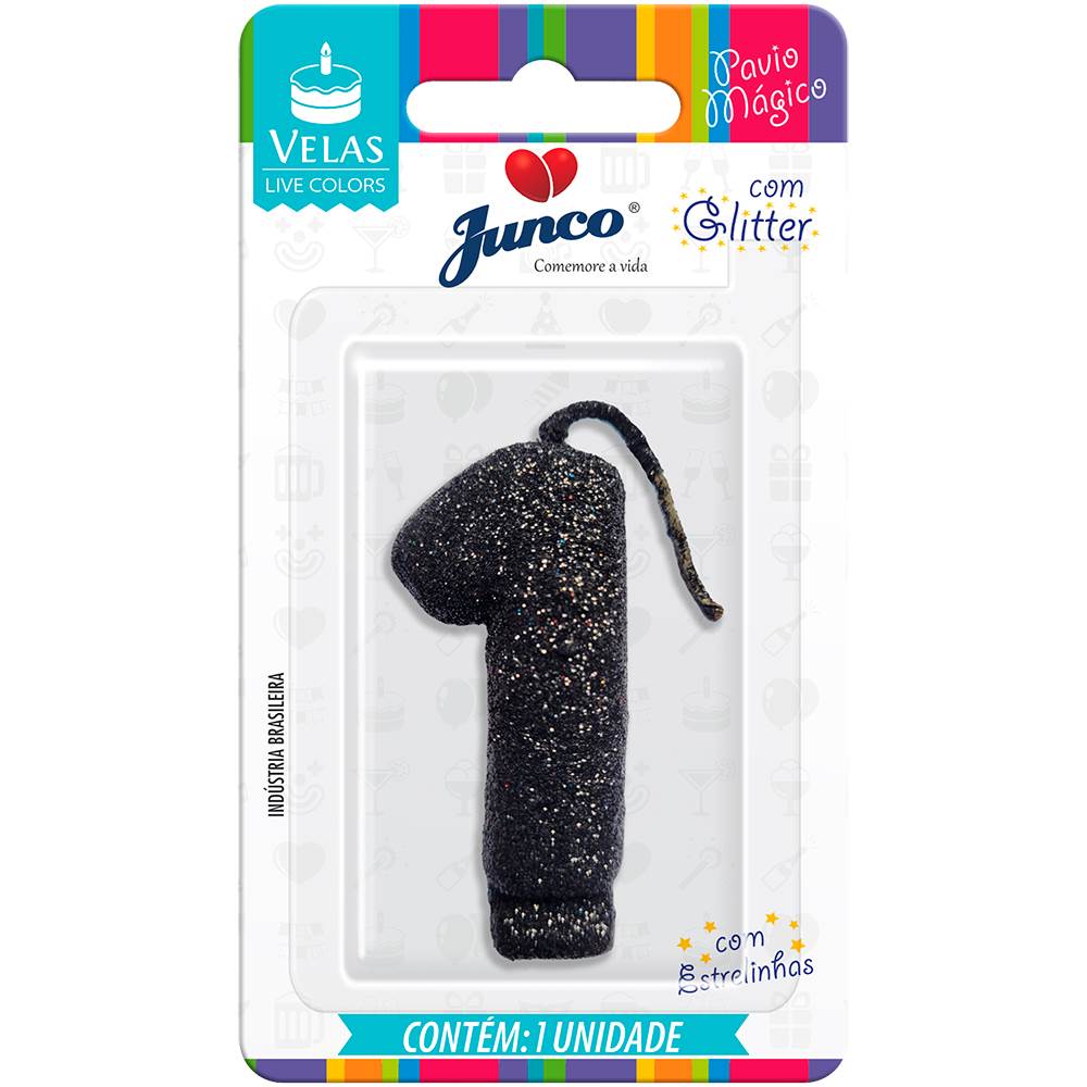 Vela Aniversário Live Colors com Glitter Preta Nº 1 Junco