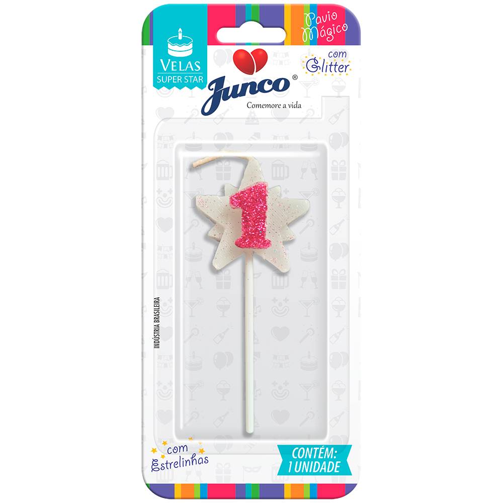 Vela Aniversário Super Star com Glitter Rosa Nº 1 Junco